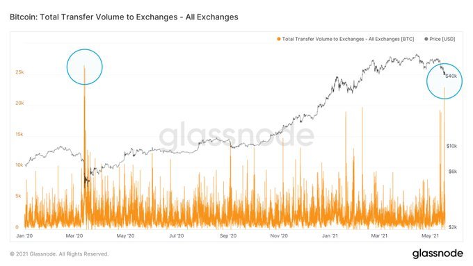 Lex Moskovoski, CIO at Moskovoski Capital, shared data showing that 22,917 BTC was transferred onto centralized exchanges in a single hour on May 18. Moskovoski noted the hourly inflow was the largest since the March 2020 “Black Thursday” crash.