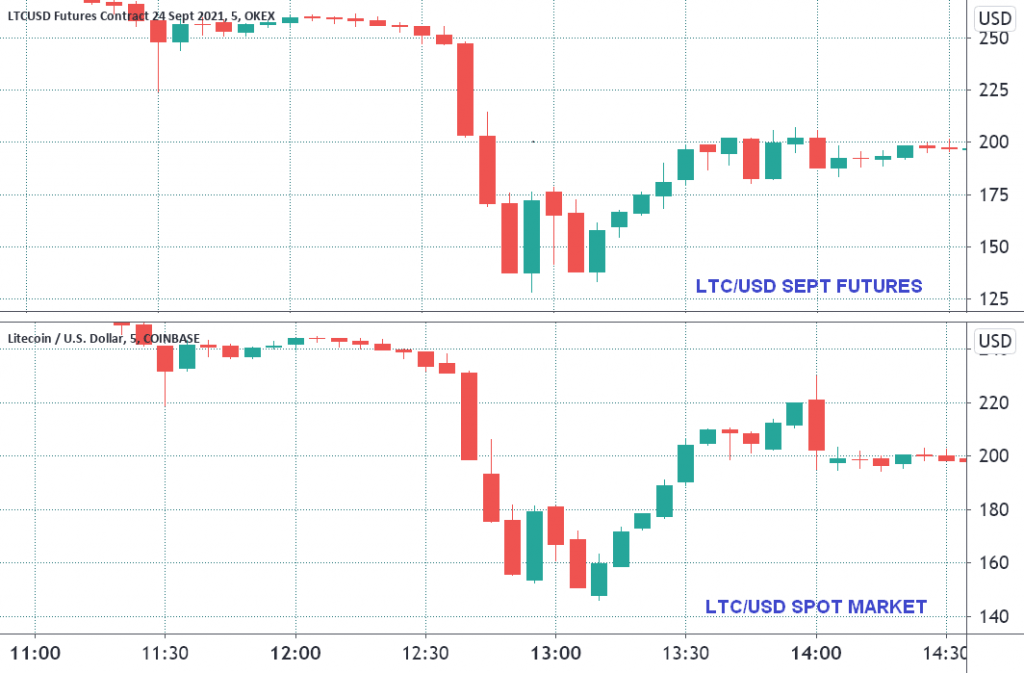 The above chart shows Litecoin’s September futures at OKEx, which traded over $250 million over the past 24 hours. Despite the liquidity, it traded at $128.20 low, while spot exchanges had a $152.50 bottom. The 16% price difference shows how both perpetual futures and monthly contracts price might face momentarily price distortions.
