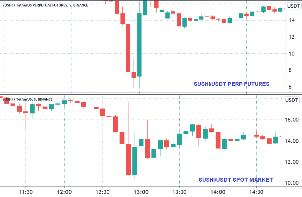 Sushi perpetual futures at Binance hit a $5.80 low, while regular spot markets bottomed at $10.25, a 43% difference. Notice that such extreme gaps seldom last for more than 15 minutes, as new market participants enter the scene to buy at a discount.